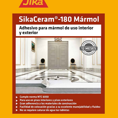 SikaCeram®-180 Marmol es un adhesivo elaborado con base en cemento, de color blanco, que mezclado con agua forma un material de pega con excelente adherencia, manejabilidad y una gran capacidad de retención de agua.