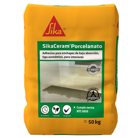 SikaCeram® Porcelanato es un adhesivo cementicio, de color blanco o gris, elaborado con latex y otros aditivos especiales para mejorar su desempeño, mezclado con agua forma un material de pega de gran adherencia para piezas de baja y mediana absorción tipo porcelanato en interiores.