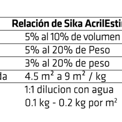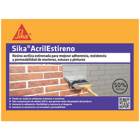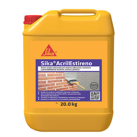 Sika® AcrilEstireno es una resina acrílica estirenada, con 50% de solidos usada para mejorar la adherencia y resistencia a la humedad en morteros, estucos, pinturas. Compatible con materiales que contienen cemento, yeso y cal. Uso interior o exterior.