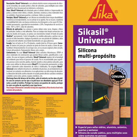 Sikasil® Universal es una masilla monocomponente a ba- se de siliconas de reticulación ácida para aplicaciones en interior y exterior.