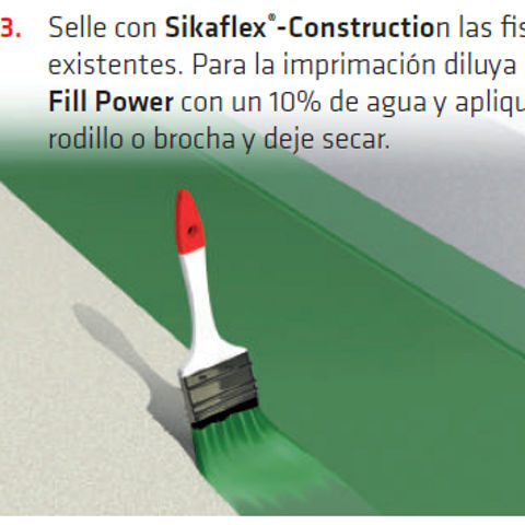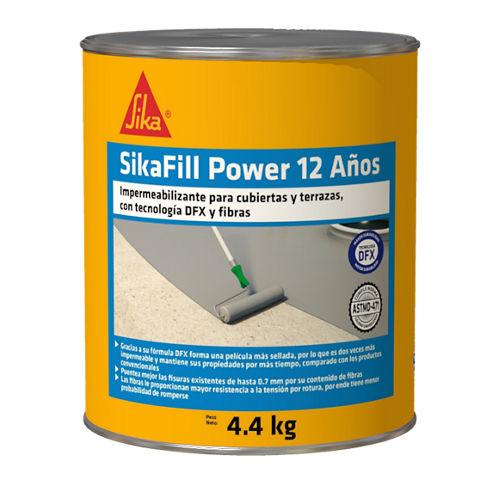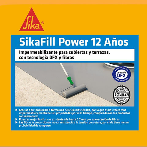 SikaFill®-12 Power es un recubrimiento elástico para la impermeabilización flexible de cubiertas, techos y terrazas. Este producto tiene una nueva fórmula mejorada con tecnología DFX (durabilidad y flexibilidad), la cual aumenta el desempeño del producto gracias a la acción del polímero estireno-acrílico. Adicional a esto, este producto se encuentra reforzado con fibras poliméricas que permiten puentear mejor las fisuras del sustrato.