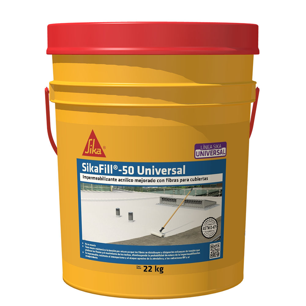 SikaFill®-50 Universal es un recubrimiento elástico impermeable a base de resinas acrílicas para la impermeabilización flexible de cubiertas, techos y terrazas. Contiene fibras que le permiten puentear mejor las fisuras estáticas del sustrato.
