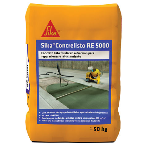 Sika® Concrelisto RE 5000 es un concreto fluido sin retracción, listo para usar en reparaciones y reforzamiento con encamisado o recrecimiento de elementos de concreto reforzado o metálicos. Este concreto listo sin retracción ha sido especialmente diseñado para alcanzar la alta manejabilidad requerida para fundir secciones densamente armadas, de bajo o altos espesores, sin presentar contracción en ninguno de los casos, desarrollando muy buenas resistencias mecánicas iniciales y finales.