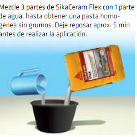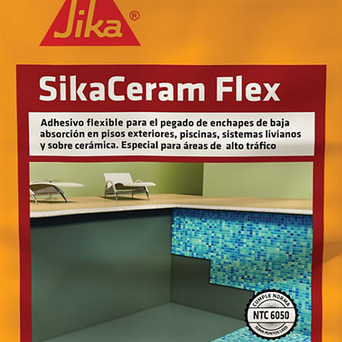 SikaCeram® Flex es un adhesivo flexible monocomponente en polvo, cementicio con látex para todo tipo de revestimiento de uso interior y pisos exteriores, resistente al deslizamiento vertical, tiempo abierto extendido, y resistencia adhesiva a la tracción luego de inmersión en agua según la Norma técnica colombiana NTC 6050. Es un mortero listo para usar solo agregar agua, desarrolla alta resistencia de adherencia y flexibilidad entre los enchapes y la superficies. Puede ser utilizado hasta 10 mm de espesor. Es apto para la pega de gres, porcelanato, cerámica y piedras naturales en piscinas y áreas de alto trafico.